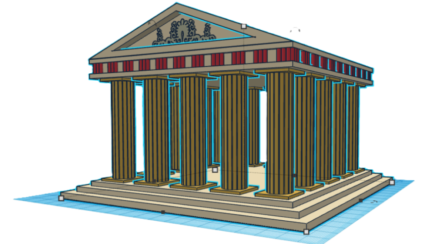 TinkerCAD è un’applicazione in cloud che permette di creare oggetti partendo da forme semplici da assemblare e distorcere, fino a raggiungere le sembianze dell’oggetto desiderato. Infatti un cilindro può diventare una colonna, un disco forato un oblò o ancora un triangolo allungato diventa il timpano di un tempio greco.